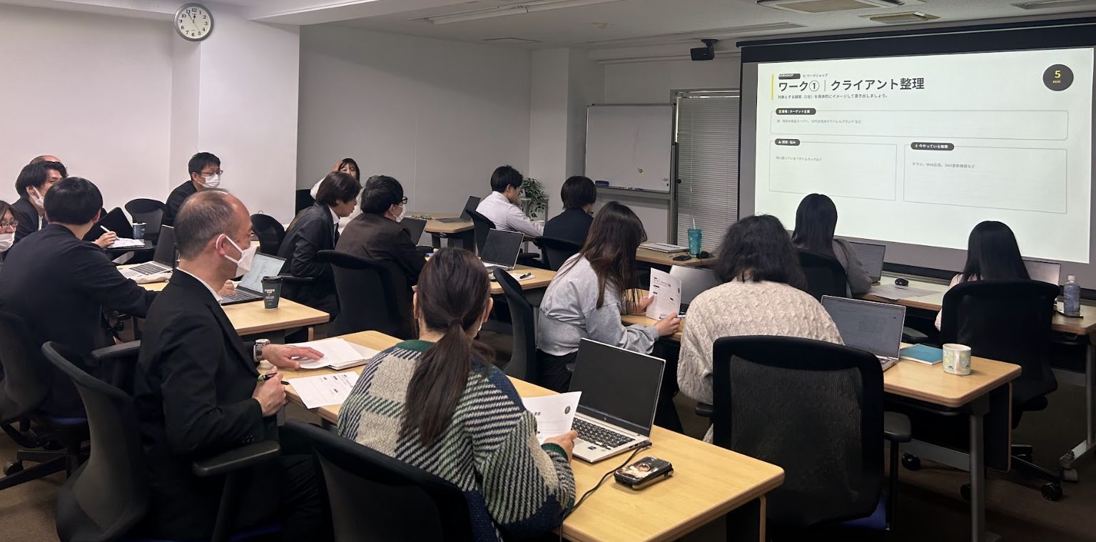 長年、大手メーカーの販促企画や各種販促ツールのプロデュースにおいて深い知見と実績を持つスピンでは、SNS活用のノウハウを蓄積し、より専門性を高めたいというニーズがありました。 本研修は、単なる媒体の紹介に留まらず、マーケティングの全体像から課題を整理し、戦略的な提案の入り口を作れるようになることを目的として開催されました 。